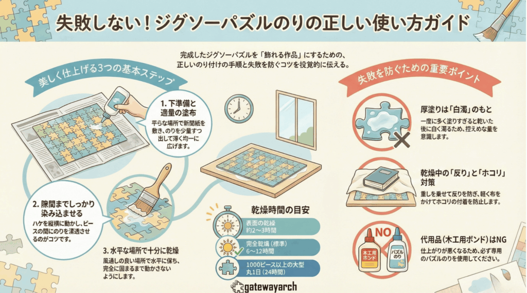 パズルのりは使い方を間違えると仕上がりに差が出てしまいます。以下は基本的な手順です。