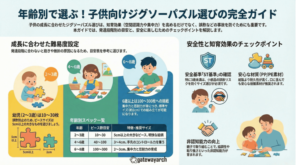 本記事では、年齢別の適正ピース数とサイズを一覧表にまとめ、親子で楽しく遊ぶ工夫や、安全性のチェックポイントを整理しました。
