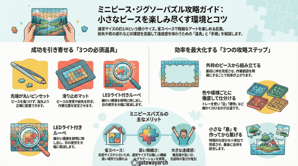 ミニピースのジグソーパズルは、省スペース性と精緻な美しさが魅力ですが、作業環境や道具選びを誤ると挫折しやすいジャンルでもあります。正しい準備とコツを知れば、通常サイズにはない達成感を味わうことができるでしょう。
