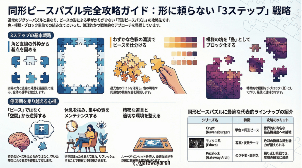 また、実際に挑戦できる同形ピース系パズルの代表作や、Gateway Archが展開する独自パズルラインナップも取り上げています。あわせて「ジグソーパズルの難易度はこう決まる」や「上級者向けパズルの選び方」など関連記事への内部リンクも紹介しています。