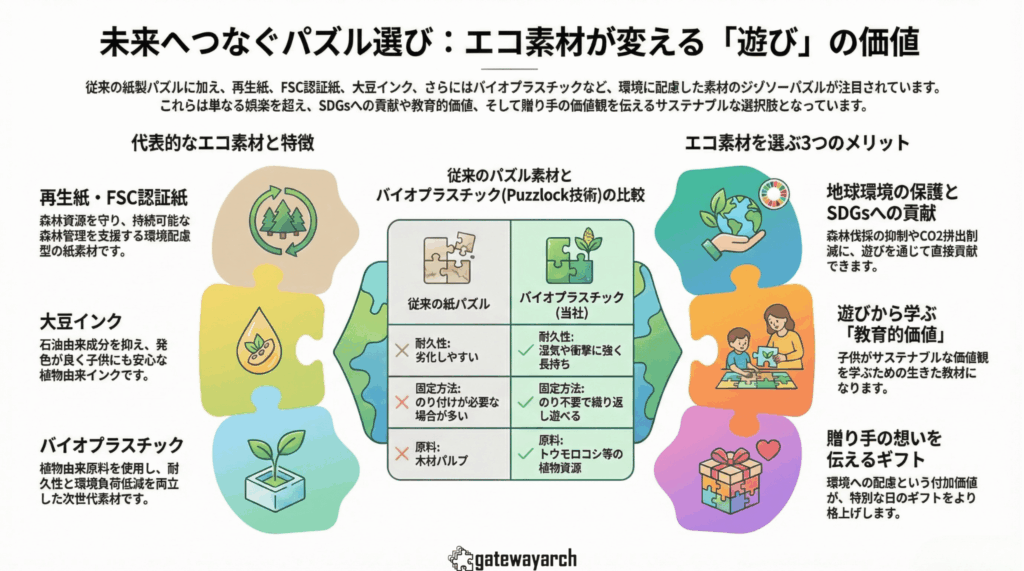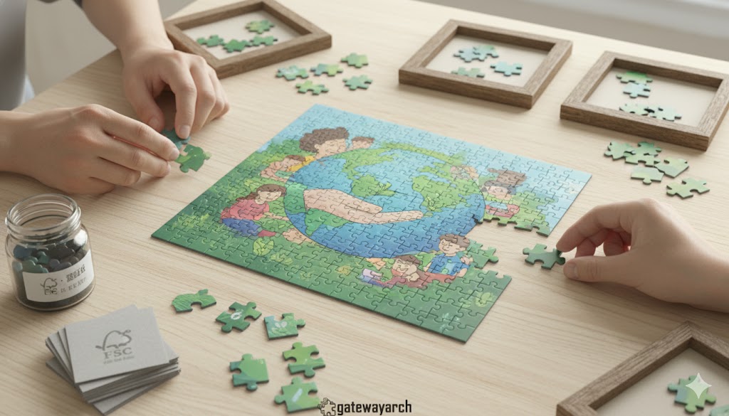 ジグソーパズルにおける「エコな素材の選択」は、遊びの延長線上で環境への配慮を実現できるでしょう。再生紙やFSC認証紙、大豆インク、そしてGateway Archのバイオプラスチック技術──選択肢は確実に広がっています。サステナブルなパズルは、ギフトにも教育にも最適。未来を意識した玩具のあり方として、これからさらに普及していくでしょう。