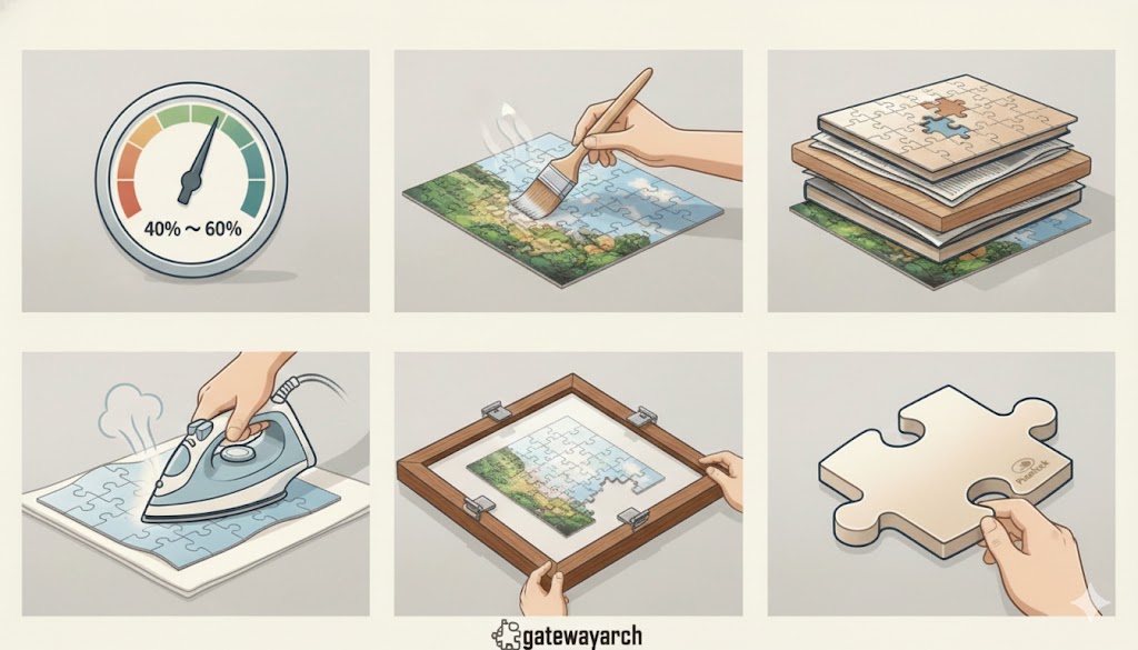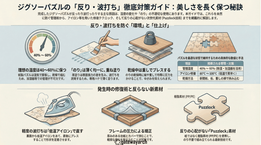 ジグソーパズルの反り・波打ちは、湿気・乾燥・のりの塗布ムラ・下地など複数の要因で発生します。未然に防止するには湿度の管理やのりの均一塗布、重しを用いたプレスが効果的で、発生してしまっても低温アイロンや長期プレスで修復することが可能です。